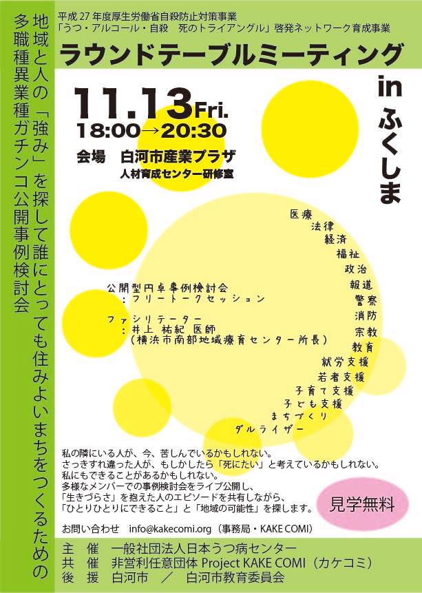 | 「うつ・アルコール・自殺 死のトライアングル」啓発ネットワーク育成事業 ラウンドテーブルミーティングinふくしま 地域と人の「強み」を探して誰にとっても住みよいまちをつくるための多職種異業種ガチンコ公開事例検討会 一般社団法人日本うつ病センター 共催・事務局:非営利任意団体Project KAKE COMI(カケコミ) メール:info@kakecomi.org |
