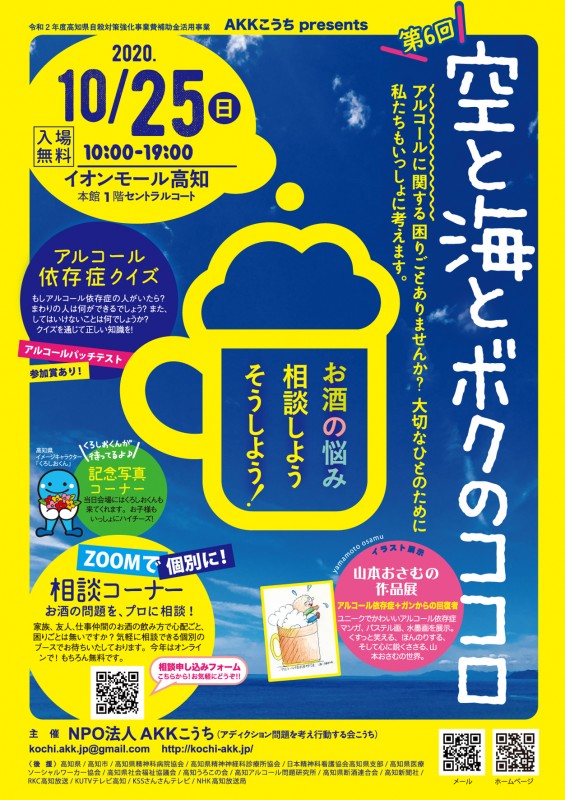 ーAKKこうち presentsー 第6回 空と海とボクのココロ お酒の悩み 相談しよう そうしよう! 2020お酒の悩み相談コーナー イオンモールの会場で相談 自宅からZoom(オンライイン)で相談 早期予約をされた方を優先いたします。 主催:AKKこうち 後援:高知県・高知県精神病院協会・高知県精神神経診療所協会・日本精神科診療所協会高知県支部・高知県医療ソーシャルワーカー協会・高知県社会福祉協議会・高知うろこの会・高知アルコール問題研究所・高知県断酒連合会・高知新聞社・RKC高知放送・KUTVテレビ高知・KSSさんさんテレビ・NHK高知放送局 要予約 参加無料 申し込みはこちら |